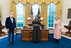 On March 15, 2016, First Lady Michelle Obama released "This Is for My Girls", a collaborative track featuring vocals from Clarkson, Janelle Monáe, Kelly Rowland, Lea Michele, Zendaya, and Missy Elliott to coincide with Barack Obama's SXSW speech and to promote the First Lady's third-world educational initiative Let Girls Learn.[114] Clarkson recorded a solo version of "It's Quiet Uptown" for The Hamilton Mixtape. Her version was released on November 3, 2016, as a promotional single for the album.[115] She also recorded a duet called "Love Goes On" with Aloe Blacc for the original soundtrack of The Shack, which was released in the United States on March 3, 2017.[116] On May 11, 2017, it was announced that Clarkson would join The Voice as a coach for the series' fourteenth season.[117]