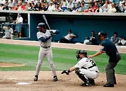 On April 3, 1989, in his first MLB plate appearance, Griffey hit a line-drive double off Oakland Athletics pitcher Dave Stewart at the Oakland Coliseum.[20] One week later in his first at-bat at the Kingdome, Griffey hit his first major league home run.[21] Entering the majors, Griffey was a highly touted prospect. In 1989, he was the #1 card in Upper Deck's first set of baseball cards, with his card becoming one of the most popular cards of its era.[22][23] He also licensed a chocolate bar in 1989 in Seattle that sold more than 1 million bars in its first year.[24][25]