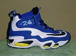 Griffey's defense in center field was widely considered the standard of elite fielding during the decade, exemplified by his streak of 10 consecutive Gold Gloves from 1990 to 1999. His impressive range allowed frequent spectacular diving plays, and he often dazzled fans with over-the-shoulder basket catches and robbed opposing hitters of home runs by leaping up and pulling them back into the field of play. He was a frequent participant in the All-Star Game with the Mariners and led the American League multiple times in different hitting categories.[10] He was featured on the Wheaties cereal box and had his own signature sneaker line from Nike.