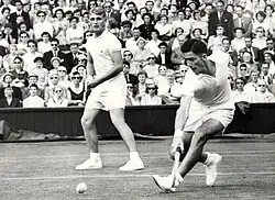 In 1954, Rosewall lost in the semifinals of the Australian championships to Rose.[39] Rosewall played "a fine net game" in beating Mal Anderson in the final of the Darling Downs tournament in April.[40] He defeated Trabert in a five-set semifinal at Wimbledon but lost the final to crowd-favorite Jaroslav Drobný in four sets.[41] At the U.S. Championships, Rosewall lost in the semifinals to Rex Hartwig.[42] At the Victorian championships in December, Rosewall won the title, beating Seixas in the final (the seventh victory by Rosewall in eight meetings between the two players).[43]