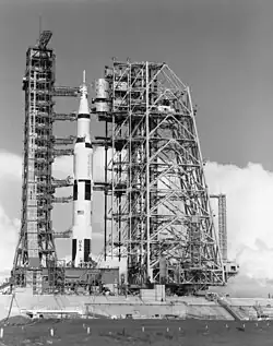 The umbilical tower contained two elevators and nine retractable swing arms that were extended to the space vehicle—to provide access to each of the three rocket stages and the spacecraft for people, wiring, and plumbing—while the vehicle was on the launch pad and were swung away from the vehicle at launch.[24][25] Technicians, engineers, and astronauts used the uppermost Spacecraft Access Arm to access the crew cabin. At the end of the arm, the white room provided an environmentally controlled and protected area for astronauts and their equipment before entering the spacecraft.[26]