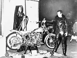 In 1961, Anger once more returned to the U.S., where he lived for a time with Marjorie Cameron.[57] He began work on a new feature, Scorpio Rising, about the biker subculture. For this, he employed a biker named Richard McAuley, and filmed him and some of his friends messing around, adding to it scenes of McAuley, or "Scorpio" as he became known, desecrating a derelict church. Anger incorporated more controversial visuals into the piece, including Nazi iconography, nudity, and clips of the life of Jesus Christ taken from the Family Films' The Living Bible: Last Journey to Jerusalem, images of Jesus which are intercut with those of Scorpio. The film has a soundtrack of popular 1960s songs, including "Blue Velvet" by Bobby Vinton, "Torture" by Kris Jensen, and "I Will Follow Him" by Little Peggy March.[58] Anger called the film "a death mirror held up to American culture ... Thanatos in chrome, black leather, and bursting jeans."[59] It immediately became popular on the underground cinema scene but was soon brought to court on obscenity charges. The jury ruled in favor of the prosecutors and Scorpio Rising was banned; the ban was overturned on appeal to the California Supreme Court.[60]