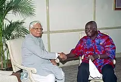 After leaving office, Kaunda clashed frequently with Chiluba's government and the MMD. Chiluba later attempted to deport Kaunda on the grounds that he was a Malawian.[69] The MMD-dominated government under the leadership of Chiluba had the constitution amended, barring citizens with foreign parentage from standing for the presidency, to prevent Kaunda from contesting the next elections in 1996, in which he planned to participate.[1] After the 1997 coup attempt, on Boxing Day in 1997 he was arrested by paramilitary policemen.[70] However, many officials in the region appealed against this; on New Year's Eve of the same year, he was placed under house arrest until his court date.[71] In 1999 Kaunda was declared stateless by the Ndola High Court in a judgment delivered by Justice Chalendo Sakala.[72][73] Kaunda however successfully challenged this decision in the Supreme Court of Zambia, which declared him to be a Zambian citizen in the Lewanika and Others vs. Chiluba ruling.[74]