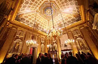 The entryway to the King's State Apartments is marked by the King's Staircase, decorated with a painting by William Kent depicting George I's royal court, completed in 1724.[49] The apartment possesses several reception rooms. The Presence Chamber features a limewood fireplace where the monarch received ministers. The Privy Chamber was one of Queen Caroline's favourite entertaining spaces. The Cupola Room has been described as the "most splendidly decorated room in the palace", also by Kent.[47]