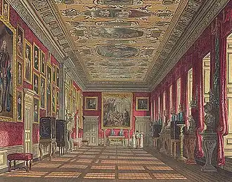 The King's Drawing Room, where courtiers would come "in search of power and patronage", features a copy of Venus and Cupid by Giorgio Vasari, which Caroline attempted to have removed to no avail.[47] The King's Gallery, built for William III, is decorated with red accents and golden ornaments, used for exercise and displaying paintings. Featuring numerous works by Kent, it houses Charles I at the Hunt by Anthony van Dyck.[50]