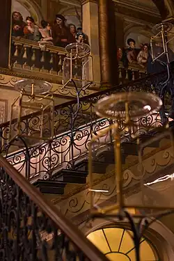 The Queen's State Apartments consist of the rooms where Mary II and later royal consorts resided.[48] The Queen's Staircase is "deliberately plainer" than its counterpart, accessible to the gardens.[48] The Queen's Gallery, built in 1693, was previously filled with Turkish carpets and oriental artifacts, and was designed as a place for Mary to fulfil "simple pastimes such as walking, reading, and needlework."[48] The Queen's Dining Room is where Mary and William would take their meals together in private, featuring 17th-century panelling.[48] The Queen's Drawing Room features décor from China and Japan, and features William and Mary's intertwined monogram carved into the crown moulding.[48] Mary's bedroom, where she entertained friends, is included in the apartments.[48]