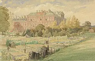 Shortly after William and Mary assumed the throne as joint monarchs in 1689, they began searching for a residence better suited for the comfort of the asthmatic William.[5] Whitehall Palace was too near the River Thames, with its fog and floods, for William's fragile health. In the summer of 1689, William and Mary bought the property, then known as Nottingham House, from the Secretary of State Daniel Finch, 2nd Earl of Nottingham, 7th Earl of Winchilsea, for £20,000.[6] They instructed Sir Christopher Wren, Surveyor of the King's Works, to begin an immediate expansion of the house. In order to save time and money, Wren kept the structure intact and added a three-storey pavilion at each of the four corners, providing more accommodation for the King and Queen and their attendants. The Queen's Apartments were in the north-west pavilion and the King's in the south-east.[7]