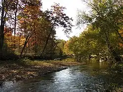 Franklin Township was surveyed in 1803 and settled in November 1805 when John Haymaker and his family moved west from Warren to the banks of the Cuyahoga River. They were joined by John's brother George and their father Jacob Haymaker and their families early the next year, and built a gristmill in 1807.[7] Initial growth in the area was slow, but eventually two small villages developed due to the potential for power generated by the Cuyahoga River to be used in gristmills and manufacturing. The first village, known as Franklin Mills, or locally as the "Lower Village", developed mostly around the original Haymaker property. In 1818, Joshua Woodard arrived in the area and began constructing buildings just north of the village forming the "Upper Village" that would be known briefly as Carthage.[8]