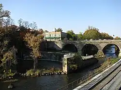 In the 1820s, Franklin Mills was included in the route of the Pennsylvania and Ohio Canal (P & O Canal). When construction began on the canal in the mid-1830s, land speculation was rampant in many areas of northeast Ohio along the canal, including Franklin Mills. As a result, an industrial and business region was established along the east side of the river in what is now downtown Kent. Factories and mills were either planned or constructed along the Cuyahoga River, some of which either were never built or ultimately failed, due mostly to effects of the Panic of 1837. A lock and attached arch dam was completed in 1836.[9] The canal officially opened in 1840, but was shut down by the 1870s.[10]