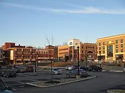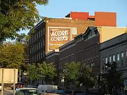 Beginning in 2008, several redevelopment projects in the downtown area were put into motion and resulted in nearly $110 million (~$157 million in 2024) in total investment from public and private sources. The first of these was the Phoenix Project, a development privately financed by Kent resident Ron Burbick that renovated and expanded a section of commercial space along East Main Street.[28] Included in the project was construction of a pedestrian alleyway lined with small shops, eventually known as Acorn Alley, which opened in 2009. A second phase of Acorn Alley opened in late 2011.[29] Other aspects of the redevelopment, which include a 360-space parking deck and bus transfer station, a hotel and conference center, and three separate mixed-use buildings, began to take shape in 2010 following the demolition of several buildings in a four block area. New offices for Ametek and the Davey Tree Expert Company opened in late 2012 along with several new small businesses on the first floors of each building.[30] The hotel, operated by Kent State University, opened in June 2013 and the new parking garage, operated by the Portage Area Regional Transportation Authority (PARTA) opened April 30, 2013, as the Kent Central Gateway.[31] In addition to parking, the facility functions as PARTA's main bus transfer station and has storefronts on the ground level facing East Erie Street.[32][33] Included in the redevelopment was the purchase and renovation of the old Kent hotel, which first opened in 1920. After being vacant since 2000, it re-opened on April 1, 2013, as a Buffalo Wild Wings and also houses offices, a wine and jazz bar, and apartments.[34] A five-story mixed-use building called The Landmark was completed in 2014 and construction started in November 2015 on an additional five-story mixed-use building featuring microapartments.[35][36] The developments attracted the attention of The Plain Dealer and The New York Times and earned the city and university the 2013 Larry Abernathy Award from the International Town–Gown Association in recognition of the positive town–gown cooperation and collaboration.[37][38][39]