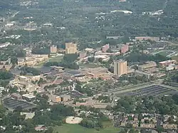 After a fire destroyed the Seneca Chain Company in 1909, one of the city's main industries at the time, city leaders created the Kent Board of Trade in 1910, a forerunner to the Chamber of Commerce. The new Board was successful later that year in having Kent selected out of twenty northeastern Ohio cities as the site of a new teacher training college, which became known as the "Kent State Normal School".[16] The site for the school was on 53 acres (21 ha) of land donated by William S. Kent, son of Marvin Kent, on what was then the eastern edge of town. By 1929 the school was renamed Kent State College after the establishment of a college of liberal arts and degrees in the arts and sciences and in 1935 was renamed Kent State University after it was given authorization to grant advanced graduate degrees. The bill giving Kent State university status was signed into law by Ohio governor and Kent native Martin L. Davey, son of John Davey.[17] During the 1950s and 1960s the growth of Kent State University combined with the effects of suburbanization resulted in significant population growth for the city, rising from just over 12,000 residents at the 1950 census to over 28,000 by 1970.[18] Black squirrels were brought to the campus from Canada in 1961 by Kent State University head groundskeeper Larry Woodell. The squirrels have become an icon for both KSU and the city.[19][20]