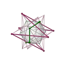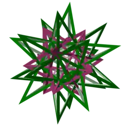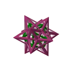 The following images show the two dual compounds with the same edge radius. They also show that the Petrie polygons are skew. Two relationships described in the article below are also easily seen in the images: That the violet edges are the same, and that the green faces lie in the same planes.