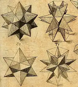 Top left to bottom right: floor mosaic in St Mark's, Venice, possibly by Paolo Uccello; great dodecahedron and great stellated dodecahedron in Perspectiva Corporum Regularium (1568); stellated dodecahedra, Harmonices Mundi by Johannes Kepler (1619); cardboard model of a great icosahedron from Tübingen University (around 1860); and the Alexander's Star.
