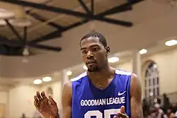 Durant and his siblings grew up in Prince George's County, Maryland, on the eastern outskirts of Washington, D.C.[13] He was unusually tall from a young age, and reached 6 ft 0 in (1.83 m) in height while still in middle school (age 10–12).[14] Growing up, Durant wanted to play for his favorite team, the Toronto Raptors,[15] which included his favorite player, Vince Carter.[15] Durant played Amateur Athletic Union (AAU) basketball for several teams in the Maryland area and was teammates with future NBA players Michael Beasley, Greivis Vásquez, and Ty Lawson, the first of whom Durant remains friends with to this day.[16][17] During this time, he began wearing #35 as his jersey number in honor of his AAU coach, Charles Craig, who was murdered at the age of 35.[18]