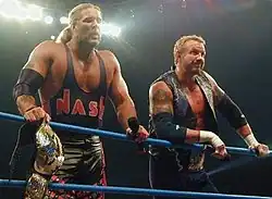 Nash won the WCW World Heavyweight Championship again from Booker T on the August 28, 2000 episode of Monday Nitro in Las Cruces, New Mexico.[32] He eventually lost it to Booker T later on at Fall Brawl. He even had a stint as WCW Commissioner,[7] and he served as a coach/mentor to the Natural Born Thrillers, who would eventually turn on Nash. Nash aligned himself with Diamond Dallas Page, reuniting the Vegas Connection, but renamed the Insiders. They feuded with the Perfect Event (Shawn Stasiak and Chuck Palumbo) and won the WCW World Tag Team Championship at Mayhem on November 26, 2000.[33][34] Shortly after, they were stripped of the title by Commissioner Mike Sanders in mid-December. Weeks later, they won the title back at Starrcade.[35][36] In 2001 (WCW's final months), the Insiders continued their feud with the Natural Born Thrillers. Nash lost another "retirement" match to Scott Steiner at SuperBrawl Revenge,[7] but it would not be long before WCW announced the sale of the company to the World Wrestling Federation. As he had a guaranteed contract with AOL Time Warner, Nash elected to wait out the remainder of his contract, which expired on December 31, 2001.
