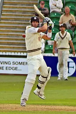 In 2000, Nottinghamshire coach Clive Rice, who had seen Pietersen play in 1997 in South Africa at a schools week, heard that Pietersen was playing club cricket for the Cannock Cricket Club and offered him a three-year contract to play for the county.[26] His maiden first-class century came on his Nottinghamshire debut against Loughborough UCCE.[50] In his first season, he made 1,275 runs with an impressive batting average of 57.95,[51] including 218 not out in an unbroken sixth-wicket stand of 352 with John Morris at Derby in July, after having been out lbw for a duck in the first innings.[52] These performances led to praise in the Wisden Cricketers' Almanack: "If he can maintain his first season's form, the name of Pietersen should be pencilled in for future Test squads."[51] This form did indeed continue into the following year: he made another unbeaten double-century, against Middlesex, taking part in a partnership of 316 for the fourth wicket with Darren Bicknell.[53] This period proved to be a purple patch for the batsman, scoring four consecutive centuries (254 not out, 122, 147 and 116) in one week in August.[54]