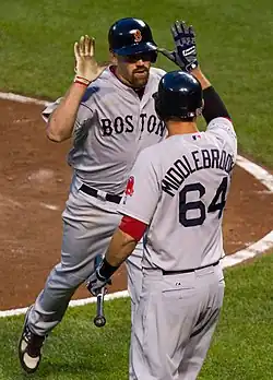 Hearing that his friend and former minor league teammate Greg Montalbano had died of testicular cancer at the age of 31 late on August 21, Youkilis dedicated his next game to his friend's memory.[124] After inscribing "GM" in marker on his cap, he hit two home runs in the game against the Yankees, while driving in six runs. Both times as he crossed home plate, he looked up and pointed to the sky. "That was for him", Youkilis said. "There are some crazy things that have happened in my life. You … feel like there's somebody out there somewhere pushing balls out for you, and doing great things."[125]