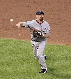 On September 24, which was Yom Kippur, Youkilis appeared in the dugout in uniform, but declined to participate in the game out of deference to the religious holiday.[58] Youkilis was named the club's Rookie of the Year by the Boston chapter of the Baseball Writers' Association of America.[35] For the season, in 44 games, he saw an average of 4.67 pitches per plate appearance, first among major leaguers with at least 90 plate appearances. As Youkilis observed, "Fighting off pitches, fouling off pitches, laying off pitches, making it so the opposing pitcher can't breathe; that's my job."[59] He was on the roster for the Red Sox for the 2004 American League Division Series (ALDS), making his sole appearance in Game 2 against the Anaheim Angels. "It's been an unbelievable ride", Youkilis said. "It's a great first year, a year you probably can't top. Hopefully, it ends like a Cinderella story."[60] He was removed from the roster for the next round, the American League Championship Series (ALCS), and was on the roster but did not play in the World Series.