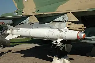 Based on an air-to-air missile, the beam-riding Kh-66 had been the Soviet Union's first air-to-ground missile for tactical aircraft, entering service in 1968.[6] However it proved difficult to use in practice as the launch aircraft had to dive towards the target. A version with radio-command guidance, the Kh-23, was first tested in 1968 but problems with the guidance system meant that it would not enter service for another five years.[7] So in 1971 work began on a version with a semi-active laser seeker, which became the Kh-25.[6] This was initially known in the West as the Kh-23L.[8] State testing began on 24 November 1974, and the Kh-25 entered production in 1975.[6]