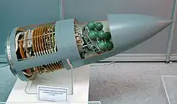 The Kh-31 (Russian: Х-31; AS-17 'Krypton')[7] is a Soviet and Russian air-to-surface missile carried by aircraft such as the MiG-29, Su-35 and the Su-57. It is capable of Mach 3.5 and was the first supersonic anti-ship missile that could be launched by tactical aircraft.[6]