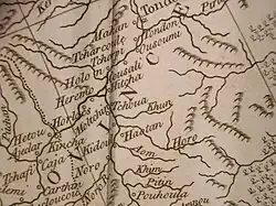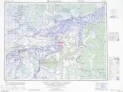 The exact location of Khabarov's Achansk has long been a subject for debate among Russian historians and geographers.[24][25] A number of locations, both upstream and downstream of today's Khabarovsk, have been proposed since Richard Maack, one of the first Russian scholars to visit the region, identified Achansk in 1859 with the ruins on Cape Kyrma, which is located on the southern (Chinese) shore of the Amur, upstream of Khabarovsk.[24] The most widely accepted point of view is probably that of Boris Polevoy, who believed that Khabarov's Achansk was located in the Nanai village later known as Odzhal-Bolon (Russian: Оджал-Болонь), located on the left bank of the Amur, closer to Amursk than to Khabarovsk. One of his arguments was that both Khabarov's Achan (sometimes also spelt by the explorer as Otshchan, Отщан), and Wuzhala (乌扎拉) of the Chinese records of the 1652 engagement are based on the name of the Nanai clan "Odzhal" (Оджал), corresponding to the 20th-century name of the village as well. (The name of the clan was also written as "Uzala", as in the name of its best-known member, Dersu Uzala).[24]