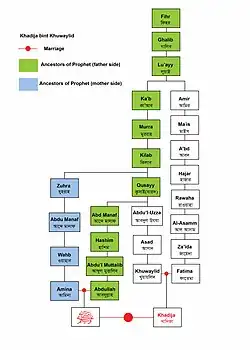 Khadija's mother, Fatima bint Za'idah, who died in 575,[2] was a member of the Amir ibn Luayy clan of the Quraysh[3] and a third cousin of Muhammad's mother, Amina.[4][5]