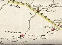 Kherson was preceded by the town of Bilechowisce, first marked on a map by Guillaume Le Vasseur de Beauplan from 1648. Bilchowisce was listed as one of the three chief towns of Yedisan in a 1701 book by English cartographer Herman Moll.[9] A French-language map of the site in 1769 (inset) shows a Russian-built fort or sconce named St. Alexandre. This had been built in 1737 during the Russo-Turkish War and served the Zaporizhian Sich as an administrative center, run by local Cossacks.