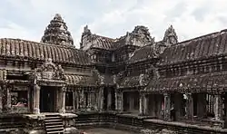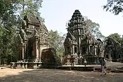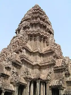 The central sanctuary of an Angkorian temple was home to the temple's primary deity, the one to whom the site was dedicated: typically Shiva or Vishnu in the case of a Hindu temple, Buddha or a bodhisattva in the case of a Buddhist temple. The deity was represented by a statue (or in the case of Shiva, most commonly by a linga). Since the temple was not considered a place of worship for use by the population at large, but rather a home for the deity, the sanctuary needed only to be large enough to hold the statue or linga; it was never more than a few metres across.[11] Its importance was instead conveyed by the height of the tower (prasat) rising above it, by its location at the centre of the temple, and by the greater decoration on its walls. Symbolically, the sanctuary represented Mount Meru, the legendary home of the Hindu gods.[12]