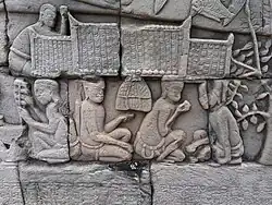 During the Angkor era, the architectural landscape consisted predominantly of temples constructed from durable materials such as brick, sandstone, and laterite. In stark contrast, the royal residences of the Khmer courts were predominantly crafted from wood and other perishable materials, rendering them susceptible to the ravages of time and leaving no trace of their existence in the present day. The enduring remnants of this era are the brick or stone temples, such as those found in the Angkor complex, which stand as the sole vestiges of what was once expansive wooden settlements and palaces.[49] However, a meticulous 13th-century account by a Chinese emissary to Angkor provides a detailed description of the palace, depicting it as an assemblage of imposing structures crowned with lead-tiled roofs. Intricately carved bas reliefs at Bayon and Banteay Chhmar portray various wooden buildings featuring triangular pediments and roofs, identified as representative of the royal halls within Angkorian palaces. As the Khmer people gradually embraced Buddhism, a discernible transition from stone temples to wooden architecture occurred. This shift marked the adoption of wooden structures as the new norm in Khmer architecture, supplanting the erstwhile prominence of stone temples in earlier periods.[50]