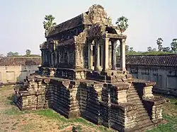 Structures conventionally known as "libraries" are a common feature of the Khmer temple architecture, but their true purpose remains unknown. Most likely they functioned broadly as religious shrines rather than strictly as repositories of manuscripts. Freestanding buildings, they were normally placed in pairs on either side of the entrance to an enclosure, opening to the west.[16]
