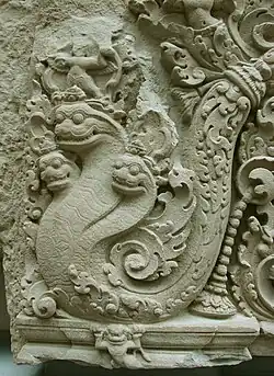 A makara is a mythical sea monster with the body of a serpent, the trunk of an elephant, and a head that can have features reminiscent of a lion, a crocodile, or a dragon. In Khmer temple architecture, the motif of the makara is generally part of a decorative carving on a lintel, tympanum, or wall. Often the makara is depicted with some other creature, such as a lion or serpent, emerging from its gaping maw. The makara is a central motif in the design of the famously beautiful lintels of the Roluos group of temples: Preah Ko, Bakong, and Lolei. At Banteay Srei, carvings of makaras disgorging other monsters may be observed on many of the corners of the buildings.