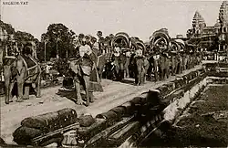 The majority of the Cambodians live in rural villages either as rice farmers or fishermen. Their life revolves around the Wat (temple) and the various Buddhist ceremonies throughout the year. However, if Cambodians become ill, they will frequently see a kru khmae (shaman/healer), whom they believe can diagnose which of the many spirits has caused the illness and recommend a course of action to propitiate the offended spirit, thereby curing the illness.[51] The kru khmae is also learned in herb lore and is often sought to prepare various "medicines" and potions or for a magical tattoo, all believed to endow one with special prowess and ward off evil spirits or general bad luck.[51] Khmer beliefs also rely heavily on astrology, a remnant of Hinduism. A fortune teller, called hao-ra (astrologists) or kru teay in Khmer, is often consulted before major events, like choosing a spouse, beginning an important journey or business venture, setting the date for a wedding and determining the proper location for building new structures. Throughout the year, the Cambodian celebrate many holidays, most of a religious or spiritual nature, some of which are also observed as public holidays. The two most important are Chol Chhnam (Cambodian New Year) and Pchum Ben ("Ancestor Day"). The Cambodian Buddhist calendar is divided into 12 months with the traditional new year beginning on the first day of khae chaet, which coincides with the first new moon of April in the western calendar. The modern celebration has been standardized to coincide with April 13. Dance occupies a central place for the Khmer people, one of its earliest records dates back to the 7th century, where performances were used as a funeral rite for kings.[52] In the 20th century, the use of dancers is also attested in funerary processions, such as that for King Sisowath Monivong. During the Angkor period, dance was ritually performed at temples.[53] The temple dancers came to be considered as apsaras, who served as entertainers and messengers to divinities.[54] Ancient stone inscriptions describe thousands of apsara dancers assigned to temples and performing divine rites as well as for the public.[53] The Khmer classical dance was placed in 2003 on the UNESCO World Heritage List.