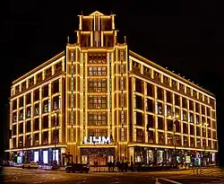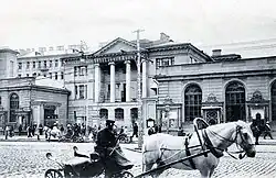 Khreshchatyk began to be developed in the 1830s and 1840s, beginning from the European Square end. Its current design emerged in 1837 when it was planned as Kyiv's principal street by architects that included the city architect, Ludvik Stanzani.[6] From 1868 banks started to be located on Khreshchatyk. The Kyiv Stock Exchange was built in 1869. The thoroughfare became one of the most famous in the Russian Empire.[7] The new City Hall was built on the street in 1874–1876. Other notable buildings constructed during this period were the Merchants' Hall, the concert hall, the Central Post Office, and the Club for Polish Noblemen. During the 1880s, its wooden-built restaurants and taverns were being replaced by stone-built multi-storey houses and shops. The street, with its departmental stores and hotels, was called "the only real street in Kiev," and, along with the city’s larger churches, became its central modern attraction for visitors.[5]