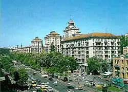 In 1944, the Soviet authorities planned to enlarge Khreschatyk when it was rebuilt. After the end of the war, 30 damaged buildings that could have been restored were demolished.[14] The thoroughfare was rebuilt in the 1950s and 1960s. It was widened to become 75–100 metres (246–328 ft) wide, and new buildings were erected in the Neoclassical Stalinist architectural style.[8] Important buildings of the new ensemble include the headquarters of Kyiv City Council (Kyivrada), the Central Post Office (Poshtamt) and Trade Unions Building (Budynok Profspilok). The picturesque quality of Khreshchatyk was enhanced by the street being replanted with chestnut trees.[8]