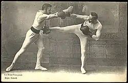 The French were the first to include boxing gloves into a sport that included kicking and boxing techniques. In 1743, modern boxing gloves were invented by Englishman Jack Broughton.[29] Frenchman Charles Lecour added English boxing gloves to la boxe française.[30] Charles Lecour was a pioneer of modern savate or la boxe française. He created a form where both kicking and punching was used.[31] Lecour was the first to view savate as a sport and self-defense system. The French colonists introduced European boxing gloves into the native Asian martial arts in French Indochina. The use of European boxing gloves spread to neighboring Siam.
