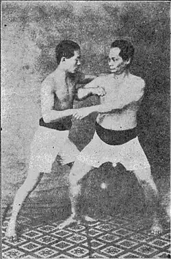 On December 20, 1959, a Muay Thai match among Thai fighters was held at Asakusa town hall in Tokyo. Tatsuo Yamada, who established "Nihon Kempo Karate-do", was interested in Muay Thai because he wanted to perform karate matches with full-contact rules since practitioners are not allowed to hit each other directly in karate matches. He had already announced his plan which was named "The draft principles of project of establishment of a new martial art and its industrialization" in November 1959, and he proposed the tentative name of "karate-boxing" for this new art.[32] It is still unknown whether Nak Muay was invited by Yamada, but it is clear that Yamada was the only karateka who was really interested in Muay Thai. Yamada invited a champion Nak Muay (and formerly his son Kan Yamada's sparring partner), and started studying Muay Thai. At this time, the Thai fighter was taken by Osamu Noguchi who was a promoter of boxing and was also interested in Muay Thai.[14][33] The Thai fighter's photo was on the magazine "The Primer of Nihon Kempo Karate-do, the first number" which was published by Yamada.