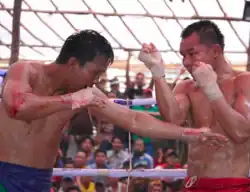 - Burmese Lethwei — a traditional Burmese martial art of which has now grown into a popular kickboxing event that allows headbutts, knees and elbow strikes. It bears resemblance to neighboring Muay Thai, but Lethwei uses more punches and less kicks.[23] Head butt, choking and throwing techniques are also used. The fighting intensity and momentum is also considered faster. No boxing gloves are used. There is also no scoring system and knockout is the only way to win a match.