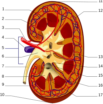 1. Renal pyramid • 2. Interlobular artery • 3. Renal artery • 4. Renal vein 5. Renal hilum • 6. Renal pelvis • 7. Ureter • 8. Minor calyx • 9. Renal capsule • 10. Inferior renal capsule • 11. Superior renal capsule • 12. Interlobular vein • 13. Nephron • 14. Renal sinus • 15. Major calyx • 16. Renal papilla • 17. Renal column