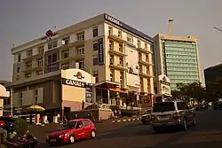 Kigali's central business district (CBD), sometimes known by the Kinyarwanda term mu mujyi ("in town"), is on Nyarugenge Hill and was the site of the original city founded by Richard Kandt in 1907.[35] The house that Kandt lived in is now the Kandt House Museum of Natural History.[14] The CBD is situated towards the western edge of the built-up area,[35] as the terrain to the east was more suitable for development of the expanding city than the high slopes of Mount Kigali to the west. Several of Rwanda's tallest buildings, including the 20-storey Kigali City Tower, are located in the CBD, as are the headquarters of the country's largest banks and businesses.[92] Other buildings in the CBD include the upmarket Serena, Marriott and Mille Collines hotels,[93] the University Teaching Hospital of Kigali,[94] the national university's College of Science and Technology,[95] and government buildings such as the National Bank of Rwanda and the Ministry of Finance and Economic Planning.[96][97]