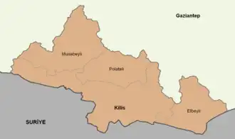 Kilis Province (Turkish: Kilis ili) is a province in southern Turkey, on the border with Syria. Its area is 1,412 km2,[2] and its population is 147,919 (2022).[1] The province was created in 1995 from the southern part of Gaziantep Province.[3][4] The city of Kilis is home to over 75% of the inhabitants of the province; the other towns and villages are very small.