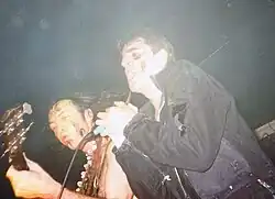 Paul Ferguson was the drummer in the band Matt Stagger when he met Jaz Coleman (from Cheltenham, Gloucestershire) in Notting Hill, London in late 1978. Coleman was briefly the keyboard player in that band. He and Ferguson then left to gradually piece together Killing Joke.[3] In the following months, they placed advertisements in Melody Maker and other music papers. Guitarist Geordie Walker joined them in March 1979,[4] followed by bassist Youth.[5] The band was formed in June 1979.[6] Coleman said their manifesto at the time was to "define the exquisite beauty of the atomic age in terms of style, sound and form".[7] Coleman gave an explanation concerning their name: "The killing joke is like when people watch something like Monty Python on the television and laugh, when really they're laughing at themselves. It's like a soldier in the first world war. He's in the trench, he knows his life is gone and that within the next ten minutes he's gonna be dead ... and then suddenly he realises that some cunt back in Westminster's got him sussed—'What am I doing this for? I don't want to kill anyone, I'm just being controlled'."[8] The band played their debut gig on 4 August 1979 at Whitcombe Lodge in Brockworth, near Gloucester, supporting the Ruts and The Selecter.[9]