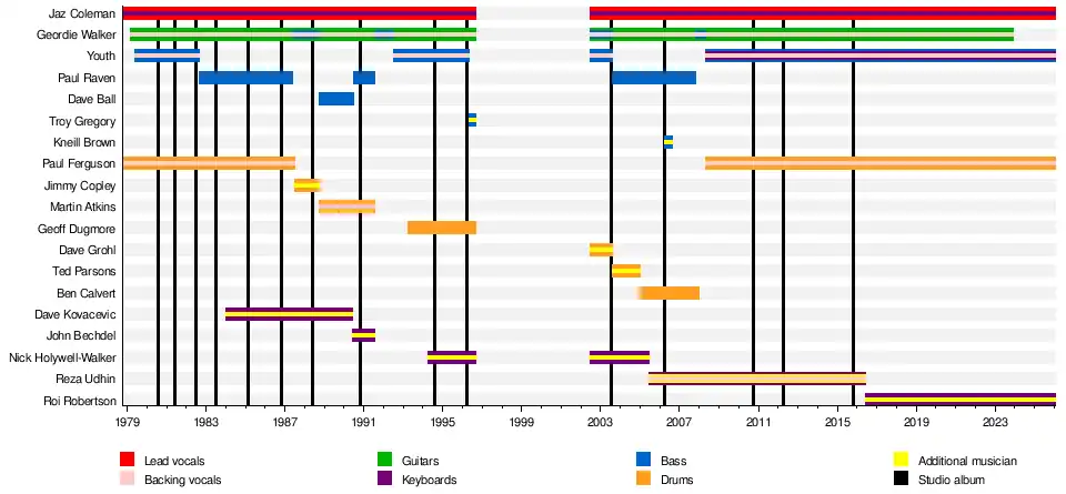 Killing Joke are an English post-punk band formed in Notting Hill, London, in 1979 by Jaz Coleman (vocals, keyboards), Paul Ferguson (drums), Geordie Walker (guitar) and Youth (bass).