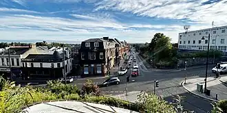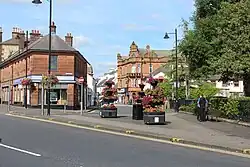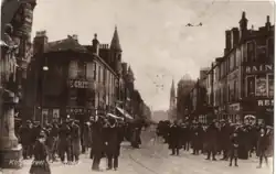 In 1945 an attempt by the Burgh Council of Kilmarnock to cope with increasing traffic was made by removing the statue of Sir James Shaw and re-developing the Cross into a roundabout.[39] In 1976, a one-way traffic system was introduced around the town centre which is still in use today as of December 2023, however, that same month, it was confirmed that studies were being conducted which would see the town centre converted back to a two way street for traffic.[40] Considerable growth of the town occurred in the second half of the 19th century, and following World War I, major efforts began to construct new homes to be "fit for heroes". New residential and commercial streets around the town were created, with large housing schemes being built in the years which followed the end of World War II. The first new housing estate in Kilmarnock following World War II would become Shortlees, followed by the Grange Estate, Bellfield and Onthank during the 1960s.[16] During this period, the priority continued to be on the construction of council housing, however, there was still a demand for houses in the private market, and with that, the construction of the Grange Estate would push the boundary of Kilmarnock's built up area.[41]