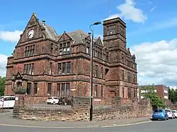 Kilmarnock (/kɪlˈmɑːrnək/ kil-MAR-nək; Scots: Kilmaurnock; Scottish Gaelic: Cill Mheàrnaig, IPA: [kʲʰiːʎ ˈvaːɾnəkʲ]), meaning "the church of Mernóc",[5] also colloquially referred to as Killie, is a town and former burgh in East Ayrshire situated in southwest Scotland. The town has served as the administrative centre of East Ayrshire Council since 1996,[6] and is the region's main commercial and industrial centre.[7] The town has a total of 284 listed buildings and structures as designed by Historic Environment Scotland, including the Dick Institute, Dean Castle, Loanhead School and the original 1898 building of Kilmarnock Academy,[8] with post-war developments of the controversial 1970s regeneration such as The Foregate and Clydesdale Bank building being considered for listed building status.[9]