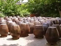 There are hundreds of different types of kimchi made with different vegetables as the main ingredients.[2] Examples of variants include baechu-kimchi, kkakdugi, chonggak-kimchi, and oi-sobagi. Traditionally, winter kimchi, called gimjang, was stored in large earthenware fermentation vessels, called onggi, in the ground to prevent freezing during the winter months and to keep it cool enough to slow down the fermentation process during summer months.[4] The process of making kimchi was called gimjang and was a way for the whole village to participate. The vessels are also kept outdoors in special terraces called jangdokdae. Recently, household kimchi refrigerators are more commonly used.[2]