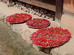 Kimchi has been a staple in Korean culture, but historical versions were not a spicy dish.[26] Early records of kimchi do not mention garlic or chili pepper.[27] Chili peppers, now a standard ingredient in kimchi, had been unknown in Korea until the early seventeenth century due to it being a New World crop.[28] Chili peppers, originally native to the Americas, were introduced to East Asia by Portuguese traders.[27][29][30] The first mention of chili pepper is found in Jibong yuseol, an encyclopedia published in 1614.[19][31] Sallim gyeongje, a 17‒18th century book on farm management, wrote on kimchi with chili peppers.[19][32] However, it was not until the 19th century that the use of chili peppers in kimchi became widespread.[33] Recipes from the early 19th century closely resemble today's kimchi.[34][35]