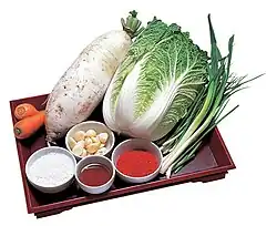 | Main ingredients | Various vegetables including napa cabbage and Korean radish |