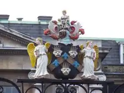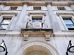 The hospital and the campus are named after Thomas Guy, who established the hospital with money from his investments in the slave-trading South Sea Company.[81] A statue of Thomas Guy, installed in 1734 and owned by the Guy's and St Thomas’ Foundation, stands outside the hospital, on the grounds of the university campus. This was boarded up in 2020, following the George Floyd protests, it was de-boarded for conservation work, with temporary interpretation added, in November 2022.[82][83] Permanent interpretation was installed in November 2023.[84]
