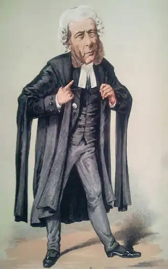 Caricature of Serjeant William Ballantine SL wearing court dress. The extremely small skullcap on the very top of the wig is a vestigal coif, worn only by serjeants-at-law. Caption reads "He resisted the temptation to cross-examine a Prince of the blood"; Vanity Fair, 5 March 1870