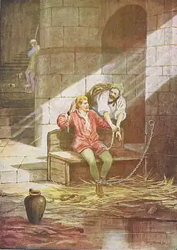 Gruffudd escaped imprisonment in Chester and slew Robert of Rhuddlan in a beachside battle at Deganwy on 3 July 1093.[110] Gruffudd recovered Gwynedd by 1095, and by 1098 Gruffudd allied with Cadwgan ap Bleddyn of the Mathrafal house of Powys, their traditional dynastic rivalry notwithstanding. Gruffudd and Cadwgan led the Welsh resistance to the Norman occupation in the north and mid-Wales. However, by 1098 Earl Hugh of Chester and Hugh of Montgomery, 2nd Earl of Shrewsbury advanced their army to the Menai Strait, with Gruffudd and Cadwgan regrouping on defensible Anglesey, where they planned to make retaliatory strikes from their island fortress. Gruffudd hired a Norse fleet from a settlement in Ireland to patrol the Menai and prevent the Norman army from crossing; however, the Normans were able to pay off the fleet to instead ferry them to Môn. Betrayed, Gruffudd and Cadwgan were forced to flee to Ireland in a skiff.[107][108]